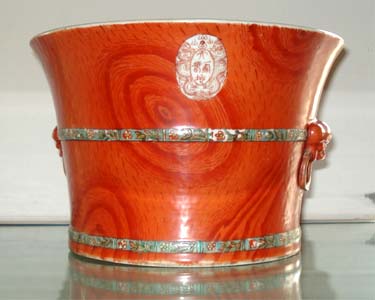仿木纹像生瓷,唐代已经出现,至清雍正开始精制,乾隆时期更加逼真。以红黑两种不同的釉彩绘成木理纹,有的还做藤条紧箍装饰,远看俨若木制器皿。常见器物有笔筒、臂搁等小件,也有大型的仿木桶、仿木盆之类。 雍正仿木纹釉盆,盆内施白釉,外壁所绘木纹几可乱真,盆底与腹部各有藤条紧箍,藤条系有三股编结而成,以浅浮雕方法表现,雕刻、绘画极工尽细,为雍正仿木瓷器中的佳品。 雍正的仿木釉器,更有以珐琅彩为之者,珐琅彩瓷器创于康熙年间,康熙至琅彩瓷器多有花卉,至雍正则大有发展,花鸟、竹石、山水争奇斗妍,更有制瓷艺人以珐琅彩料绘木纹者。 在雍正木理纹的基础上,于乾隆朝,则更发展出仿金属、仿木、仿石、仿竹、仿漆等大量品种,将瓷器的制作技巧又推向一个新的高峰。 河北三河市京东收藏家协会所藏光绪官窑仿木纹盆,高17。5厘米,口径27。5厘米,底径19。5厘米。盆内施白釉,外壁垒森严所绘橙红色木纹生动逼真,盆底与腹部各有竹藤紧箍,紧箍呈竹节状,以浅浮雕绘粉彩花卉来表现,雕刻、绘画极尽华丽。腹箍上饰一对虎吊环双耳;圈足、盆底书“大雅斋制”二行四字楷书红款,款的两侧是两个直径不足1公分的圆形渗水水孔。外壁进口沿处有椭圆形开光,开光处绘红彩二龙戏珠图案,二龙中间套一个小椭圆,圆内有篆书“天地一家春”章。 整个开光为玻璃白地,这种技术是在含铅的玻璃质中引进了“砷”元素,它的成分是pob(氧化铅),SiO2(氧化硅)和AS2O2(氧化砷)。一般做法是:先在高温烧好的白瓷上,用红黄两种不同的釉色纹釉,绘成木理纹,然后用干笔将颜色釉洗开,或者先在器物表面贴上椭圆形的湿纸,施色釉后把纸揭去,没有釉的空白处就是开光。 此花盆为慈禧太后七十大寿祝寿时烧毛制,属御制品。 (责任编辑: yuewei1986) |